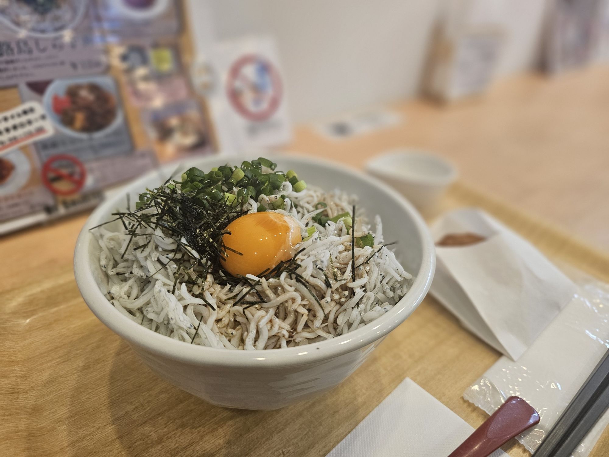磯の香り溢れるしらすに、酸味が強めで少し甘い、美味しいポン酢がよく絡みます。卵黄を割ると、味がまろやかに。たっぷりのしらすに米がどんどん消えていきます!!しらすはフワフワで食感も素晴らしいですね。