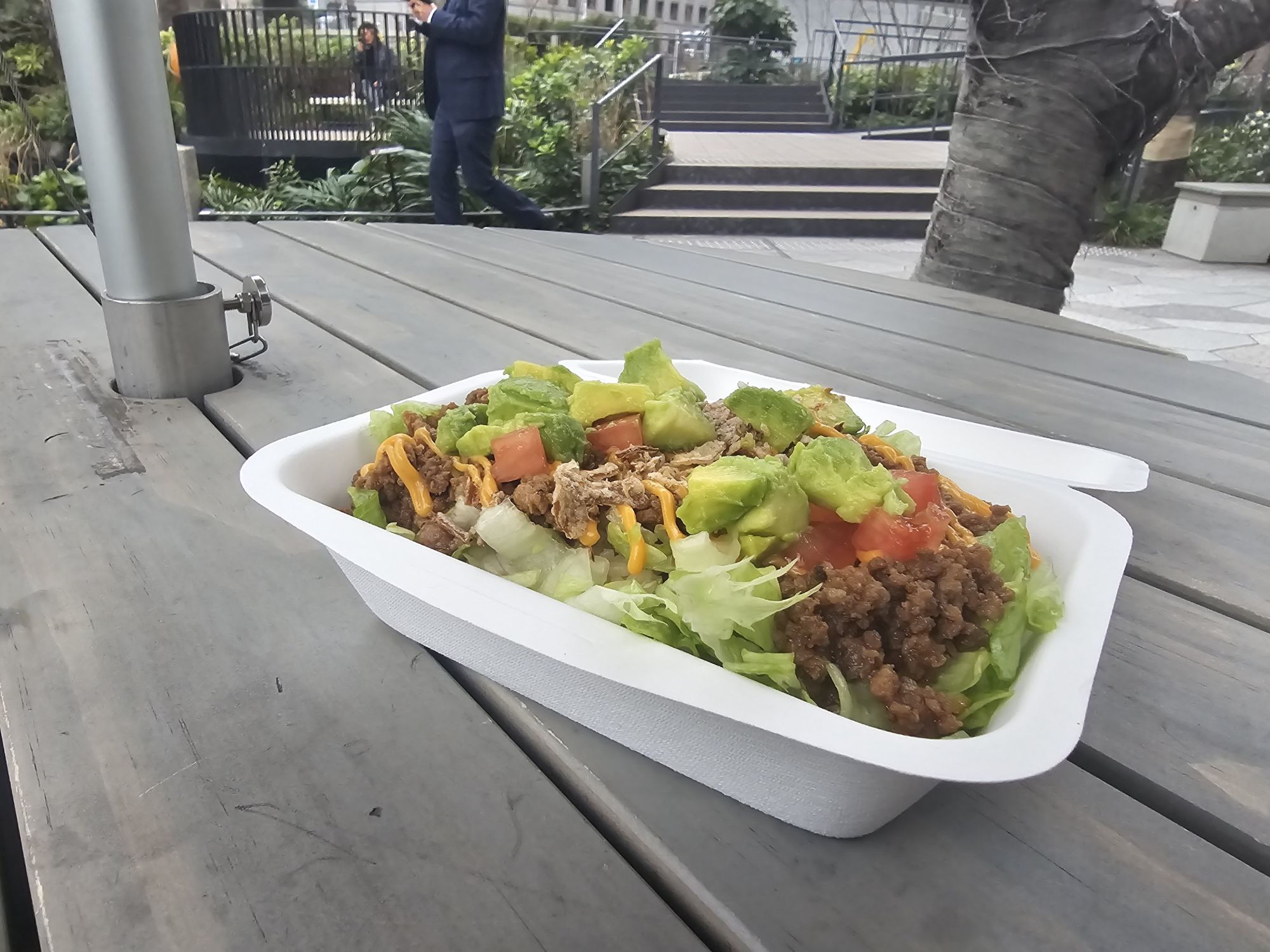 今回頂くのは、Cruizcap10.cafeのキッチンカーのアボカドチーズタコライスです!東京駅近くのトーチタワー前に出ていました!