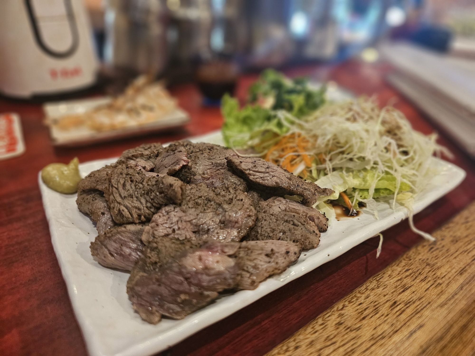先に来たのはステーキでした!わさびも添えてあっていい感じ。沖縄ではステーキを〆にする文化があり、あわよくば〆にと注文しましたが、先に来ました。笑