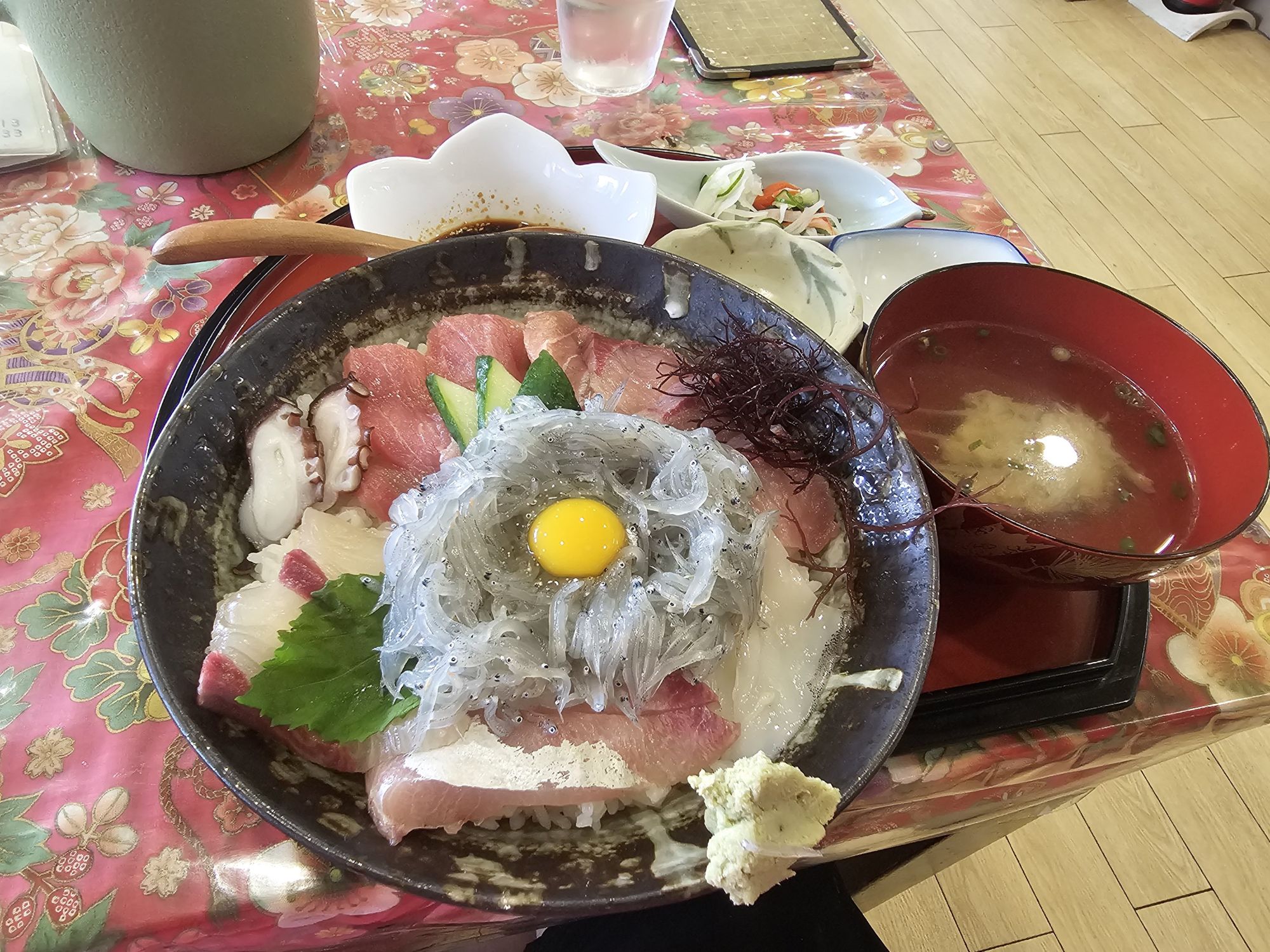 今回いただくのは、アジフライの聖地のモニュメント横にある、お食事処まつばらの海鮮生しらす丼です!!