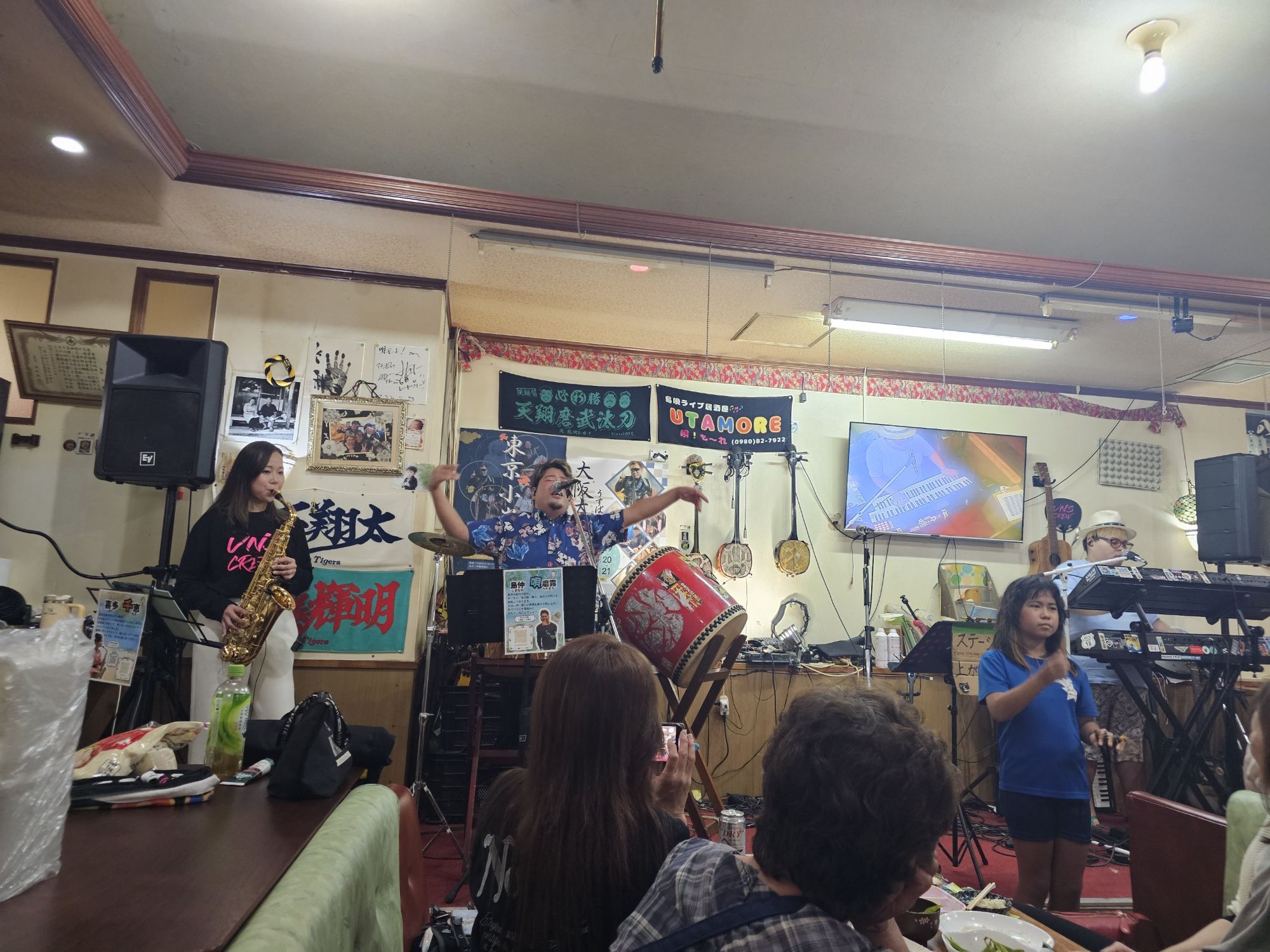 ライブが少し遅れてスタート!時間は目安みたいですね。構成は三線、琉球国太鼓+ドラム、サックス。三線担当の方はシンセにスイッチできる多彩な方でした!